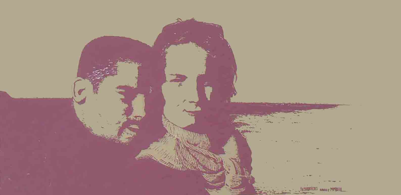 : | Le tableau représente, dans la majorité de sa partie gauche, un couple d'amis de l'artiste, accolés et en buste. Lui à gauche pose légèrement sa tête sur celle de sa compagne. La moitié de son visage sort de l'ombre qui recouvre tout le reste de son corps, se confondant avec les falaises d'Etretat au loin à l'horizon. Elle, presque au centre de la composition, est légèrement surélevée par rapport à lui, de face, en esquissant un sourire. Une écharpe entoure plusieurs fois son cou, où les plis, le noeud et les motifs sont un jeu d'ombre et de lumière. A droite de la composition, l'horizon maritime prolonge la composition, se perdant en pointe dans le vide du tableau.